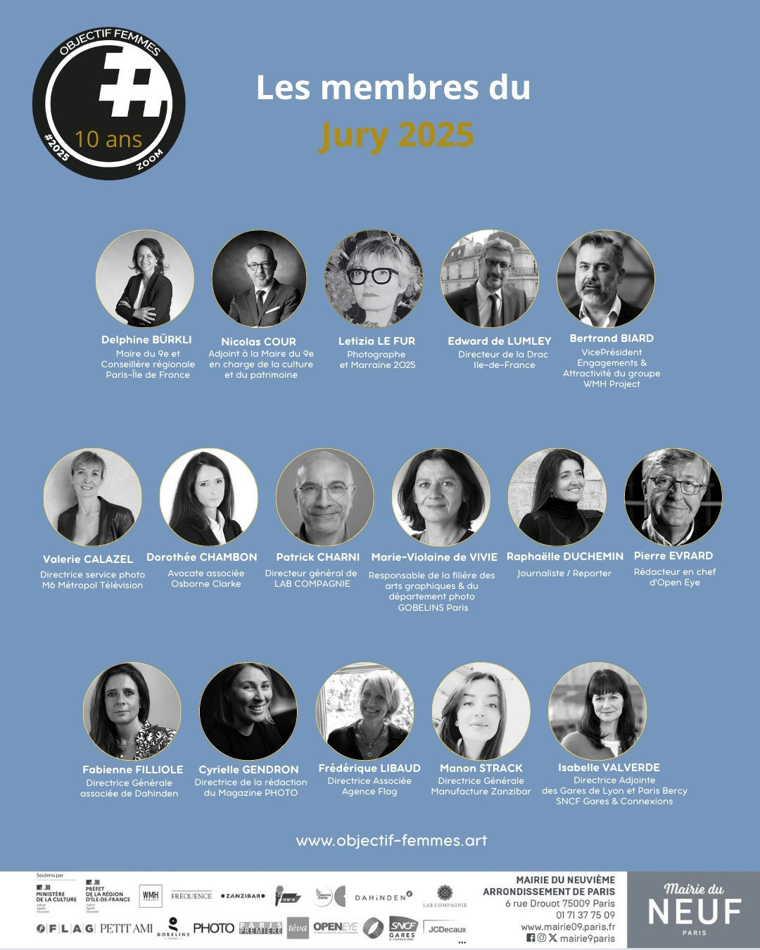 Objectif FEMMES, c’est aussi une fidélité rare. Celle de la Mairie du 9e arrondissement de Paris, qui m’accompagne depuis le début, y compris dans mes idées les plus folles. Celle de nos mécènes et partenaires, le Ministère de la Culture, la DRAC Île-de-France, WHM Project, ON AIR, Osborn Clarke et d’autres, qui ont compris que soutenir ce festival, c’est soutenir une révolution douce : celle de la visibilité, de la liberté, de la création féminine.