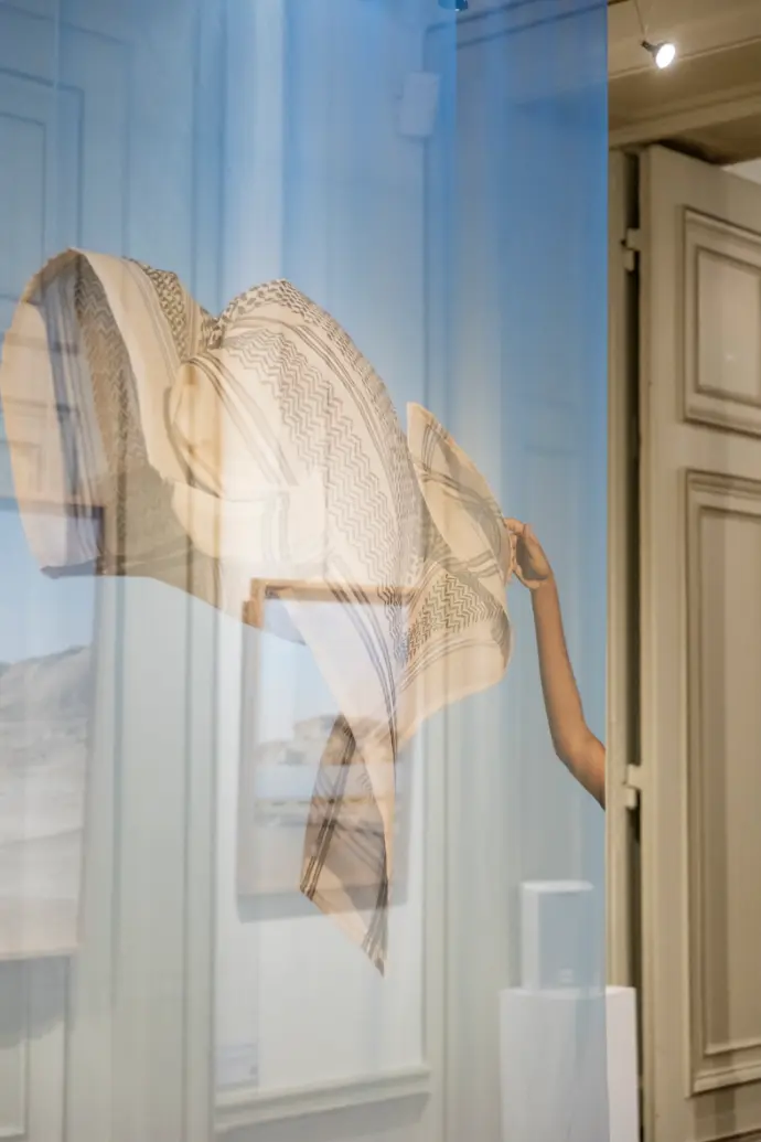 Dans SOUFFLE ARIDE, j’y vois le Bleu qui vient dialoguer avec le Sable. Il y a ces zones désertiques et rocheuses édifiées aux couleurs naturelles et puissantes que sont celles de la terre d’Oman et face à cela le Bleu, qui dessine la légèreté du ciel mais aussi la puissance maritime qui redéfini le paysage.